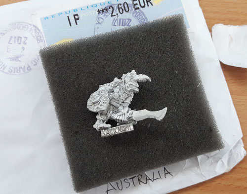 A beautifully-sculpted Rackham Goblin! Kindly sent to me by Carlo, who has been turning out some great looking goblins over the past few months. Thank you my friend! Very much appreciated, and I will certainly get him painted to join my small tribe of greenskins!