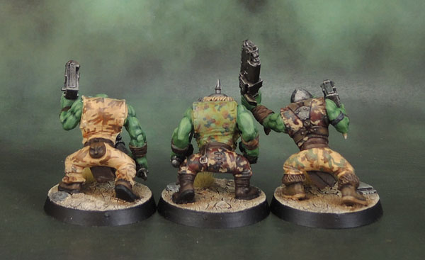 Our leftmost Ork wears UK Desert DPM, the middle one wears an AUSCAM top with a made-up camo on his pants, and the third Ork has that same made-up camo on his top and a different made-up camo for his pants. Both of the “made-up” camo schemes are (loosely) based on the Yugoslav variant of the “puzzle” pattern of camouflage – though both with 3-colours and my own arid-themed palettes.