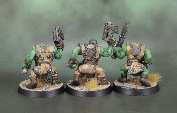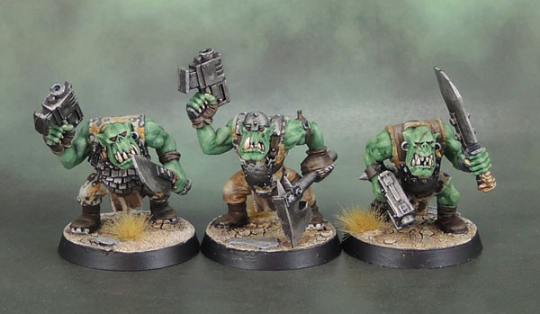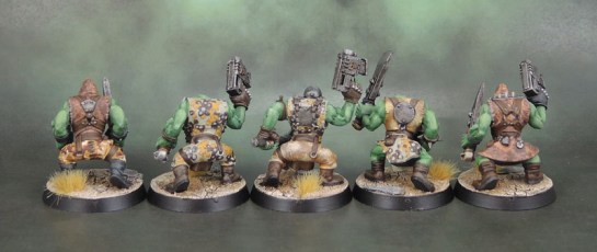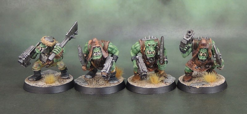 Yeah, more Ork Slugga boyz. That’s how it works, I guess, when you’re painting a horde army yet wanting to make every model pretty unique. Once again we have a mix of Fantasy and 40k Ork parts that built these four. Several of these were painted black, and it looked decent, but… I was thinking that I should probably save the black (and black camo types) for the Kommandos and similar elites.