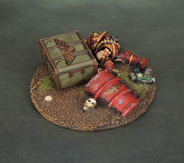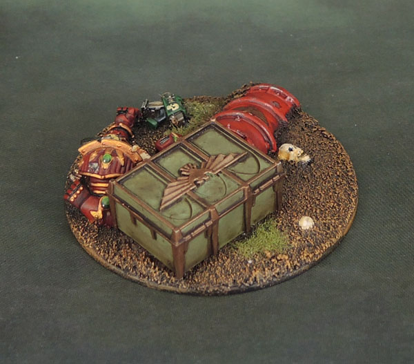 I’ll lead this post off with an objective marker that I just completed. It’s actually the previous base that the Mentor Legion Dreadnought was based on, before I pried it off for a fresh start. I considered prying the dead Chaos Marine off it as well, but then figured that it would be easier and probably more effective to just glue some more crap down to the base – so it received a munitions crate and a half-buried barrel, courtesy of some of the recent GW basing and terrain kits.