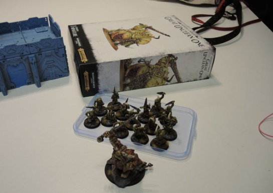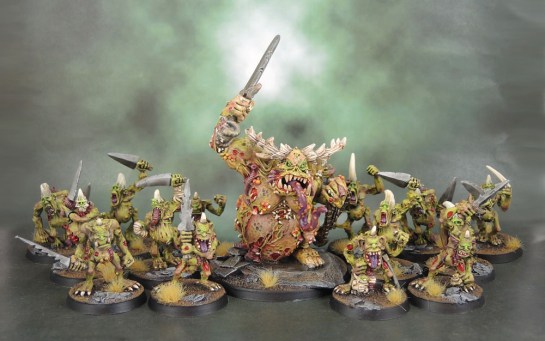 This post is doing double-duty. I’d mocked up a draft post for a couple of WIP shots from the same series I took last week, but I’ve been working on the Great Unclean one pretty constantly whenever I have some hobby time, so the model’s been changing apace from the shots I was going to post about.