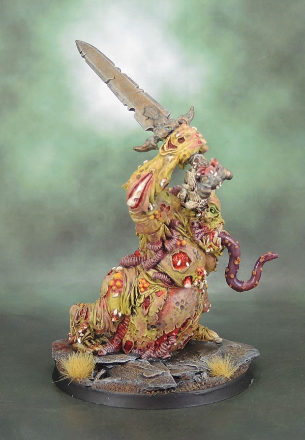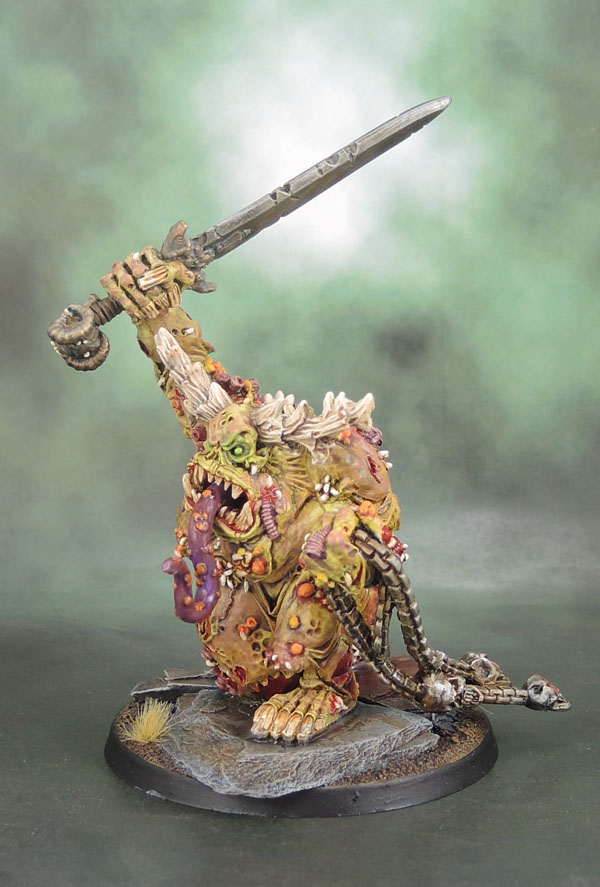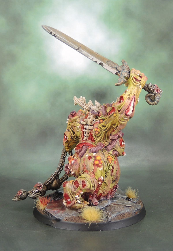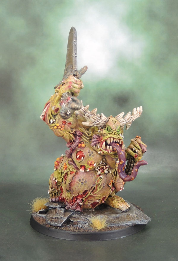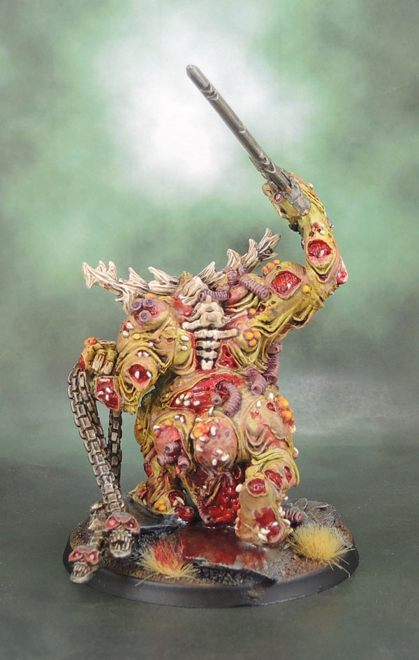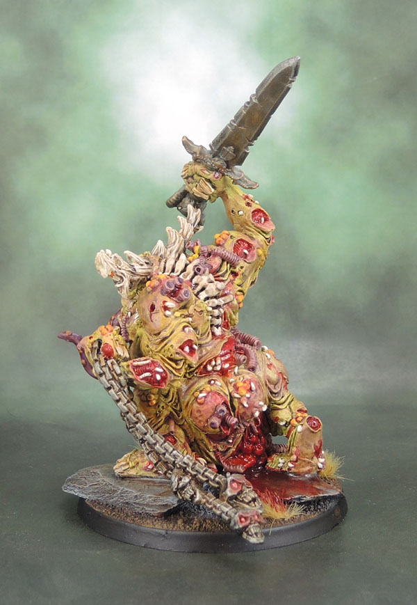 This post is doing double-duty. I’d mocked up a draft post for a couple of WIP shots from the same series I took last week, but I’ve been working on the Great Unclean one pretty constantly whenever I have some hobby time, so the model’s been changing apace from the shots I was going to post about.