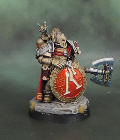 The shield looks better in hand than it does here. The red on it is actually Citadel’s “Gemstone” paint, Spiritstone Red over the top of gold. It’s got that nice shiny, translucent effect in hand wheras in the photograph is just looks very flat.