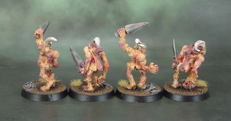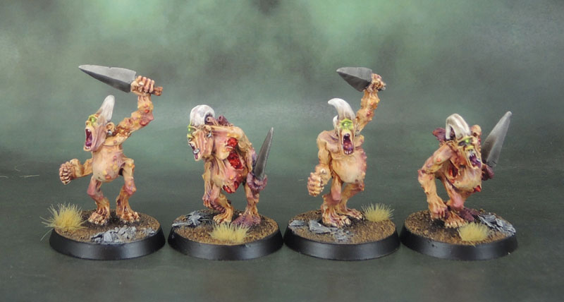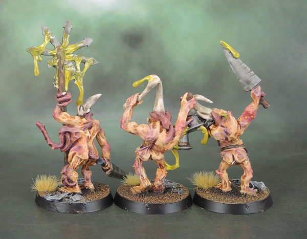 Here’s the next batch of 12 completed Plaguebearers, fresh(!) from the paint queue. This bunch has been painted with a washed-out, pale fleshy base with ruddy-flesh accents and the odd bit of purplish tentacle-worminess.