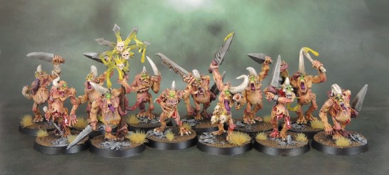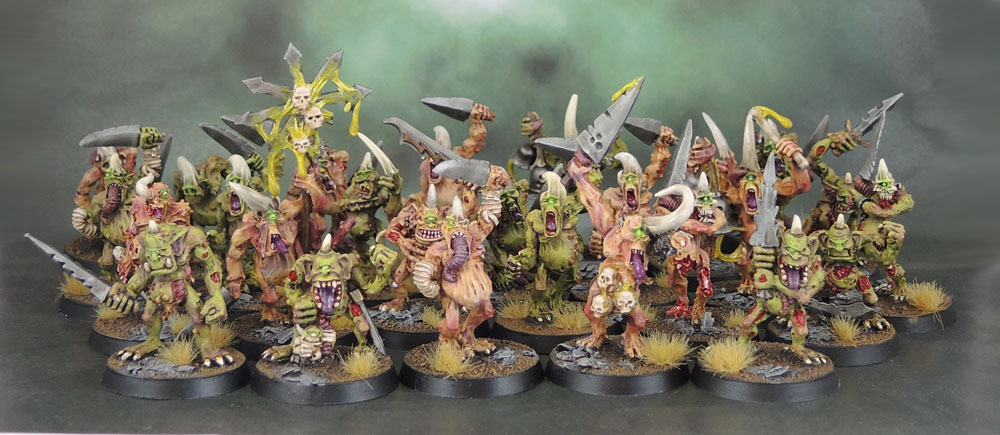 I thought this picture might be a nice way to wrap up this post. All of my painted Plaguebearers. If I need to, I can segregate them by skin tone, but I prefer to have them all mixed together in a messy horde of Nurgle’s children, even if they’re in packs of 10. Roll on completion of the next dozen in the next skin tone!