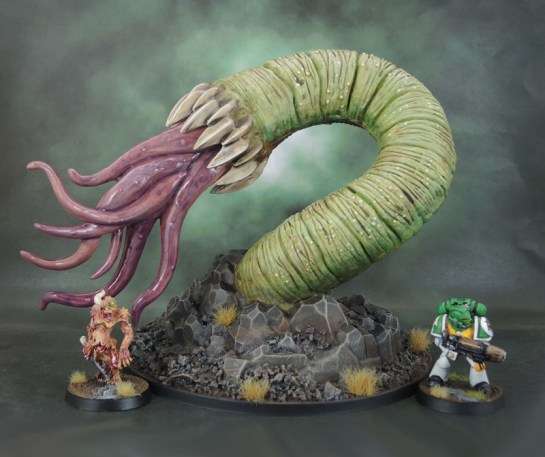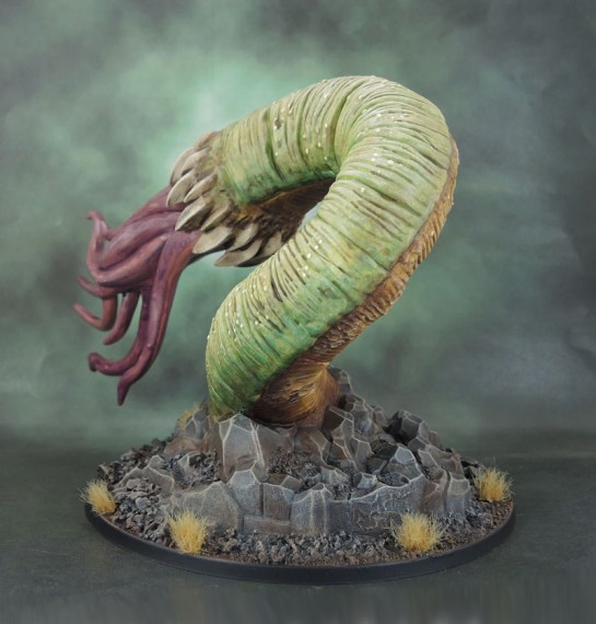 The figure itself was a matter of basecoats followed by a series of drybrushes, washes, picking out of those little bumps across the whole model and some veinage on the tentacles, and stippling in various locations to try and give it at least sort of a natural look. Matt varnish on the base and body, satin on the “teeth” and gloss on the tentacles.