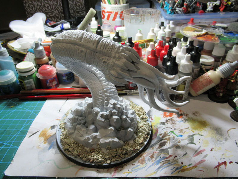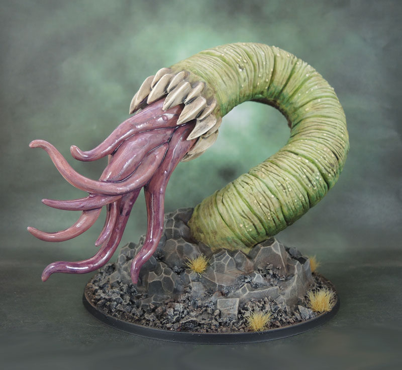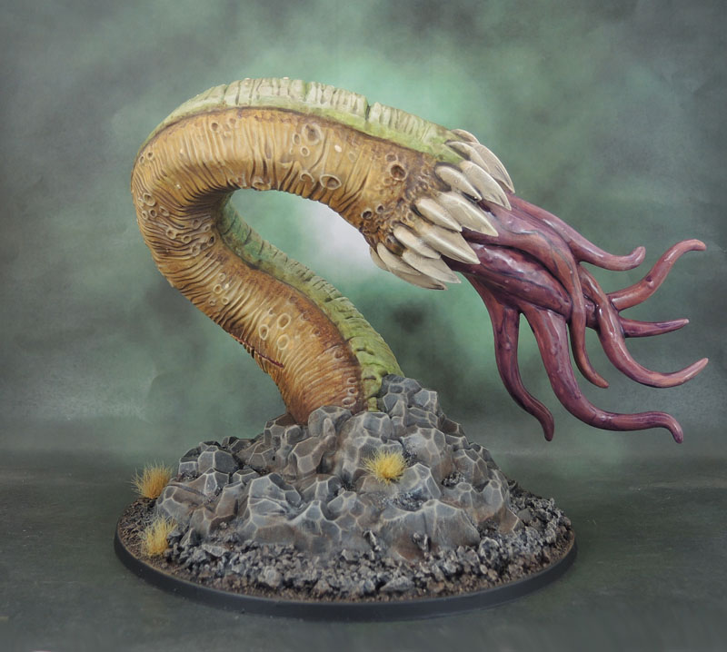 The figure itself was a matter of basecoats followed by a series of drybrushes, washes, picking out of those little bumps across the whole model and some veinage on the tentacles, and stippling in various locations to try and give it at least sort of a natural look. Matt varnish on the base and body, satin on the “teeth” and gloss on the tentacles.