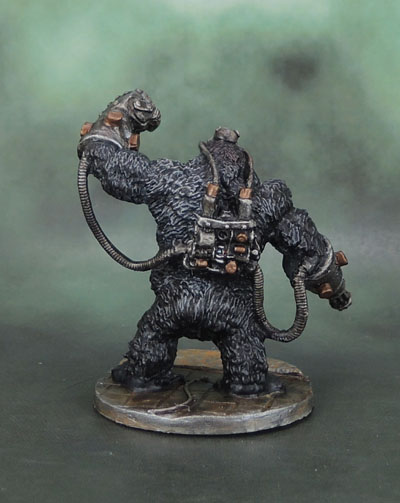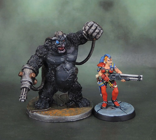 Here’s a figure that at first seems to be an odd entry. It’s a model that came with one of the Bones Kickstarters that I’ve backed, and is now available at retail as Ape-X over on Reaper’s webstore. As with many of the models released in Bones, Ape-X is a reworking of one of their previous models, in this case, Ape-X: Supervillan from their Chronoscope line. Original, metal Ape-X also has a drill attachment for his right arm as well as the gatling gun. I think I may actually have the metal version around somewhere in a tub filled with Reaper models.