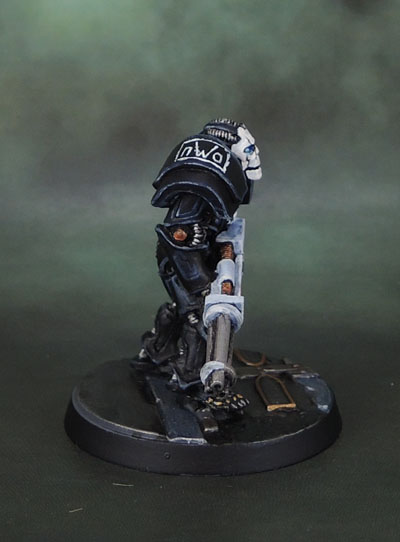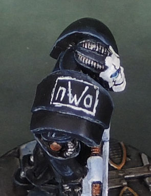 So there it is. The leather looks pretty rough in spots here, but bear in mind the size it’s blown up to here. It’s worth noting that the freehand is all untouched, mid-late 1990’s work. I thought this would be a fun model to finish and post up since I’ve been doing a lot of the WarZone stuff lately. And yes, I know neither Roddy nor Trips ever joined the nWo in any of it’s incanations, but it’s a wargames model with wrestling crap painted onto it, not an accurate historical document of wrestling’s past. 😉