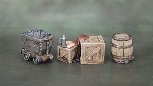 The mine cart is more than a bit undersized. It barely fits on the tracks, and if you blow on it (or look at it funny) it will fly off. However, the boxes and barrels are a bit more egregious…