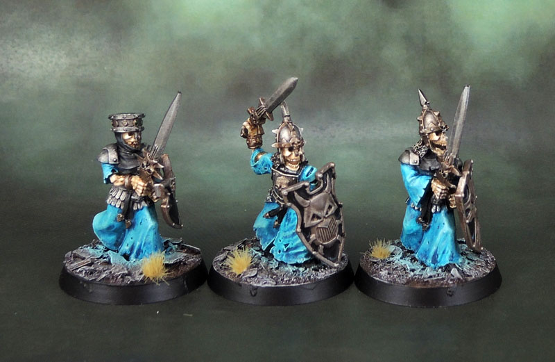 Similarly, their paint scheme was informed by the scheme I used on the other unit of Wights, which is made up of two Lord of the Rings Barrow-Wights and a single Army of the Dead plastic model in the same paint scheme. Spectral blue-green robes (yes, these are more blue-blue-green than the previous set), metal weaponry and armour, and the creature inside looking roughly how they might look that far into their death.