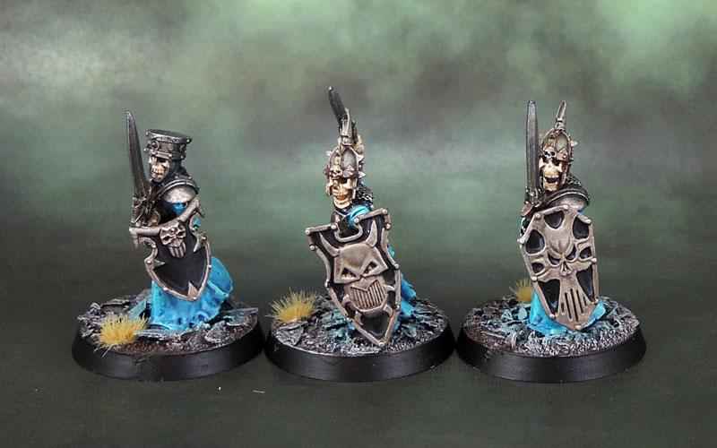 Shields came from a mid-point range of GW’s Chaos Warriors. Following the old-school, Realm of Chaos models with their open-hole shields but before the range went all-plastic. Given the skull-tastic designs on all three, I nicked them out of my shields tub for these undead fellows instead.