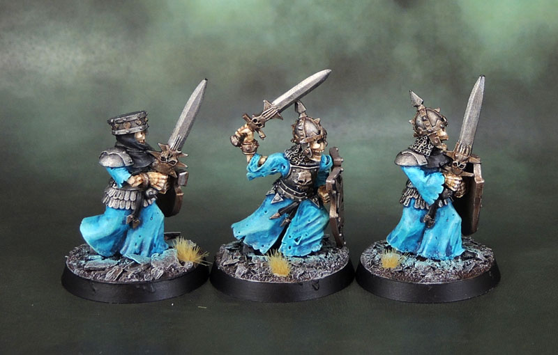So here, I’ve followed that with the robes, but the leather coifs and cuirass straps looked a bit silly in spectral blue-green, so instead I went with dark grey instead, over other choices like leather browns. Being in that awkward space between the metal armour and the spectral cloth, dark grey-black was good enough to fit in without drawing too much attention to it.