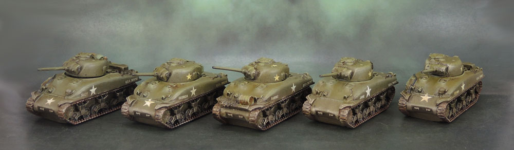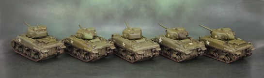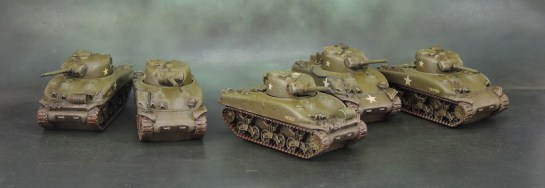 These ten M4 Sherman models are some of Battlefront’s early product – resin shermans with metal guns. I picked up these two platoons secondhand, and so they lack turret MGs (if these early models even had those). I picked these up as two sets of 5 tanks for £15.00 each back in 2012 – they were old and long OOP even then.