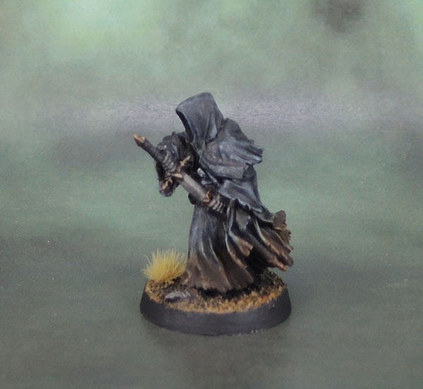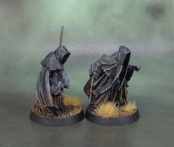 So I thought that these figures had all long been completed. That was until I got them out of a figure case and looked at them. None of these foot models or even the original trio of mounted models ever had the weathering powder applied to their robes, nor had the tufts been added to these, or the slate finished (or added in some cases) to the mounted models. The mounted Witch-King on the other hand, hadn’t had his slate painted, and had suffered some damage to his paint as a result of a base jump from a table. (Watch those waving arms near models reared up like that!) One of these regular foot Nazgûl also had fall damage that had to be repainted. FUUUUUUUUUUUU