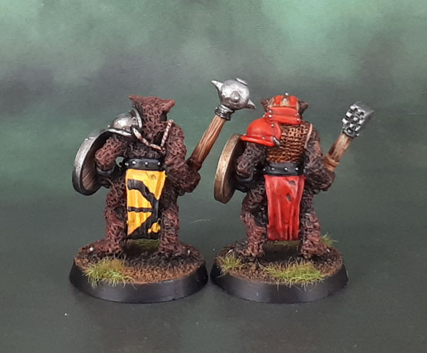 Like the pair that I just linked, this pair were again part of my nascent Imperial Guard in days gone by (aka, the original Rogue Trader era), but were kept when I sadly sold off my original Guard force and stripped – only to have started repainting in… well, fuck knows when. But it was when I was still giving my fantasy models square bases, and even using green flock. So quite awhile ago. All I really did was base them and basecoat the fur on the one, and that plus adding some bright red armour with horrible bright yellow trim on the other. So basically, these two were the opposite of something like the Warzone guy I shared the other day where it was mostly touch-ups – this pair was pretty much done from (almost) scratch. Such are the variations within the category of Neglected Models.