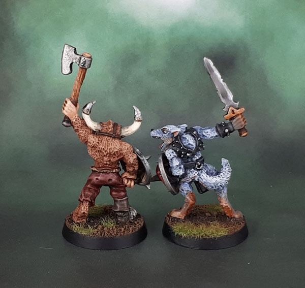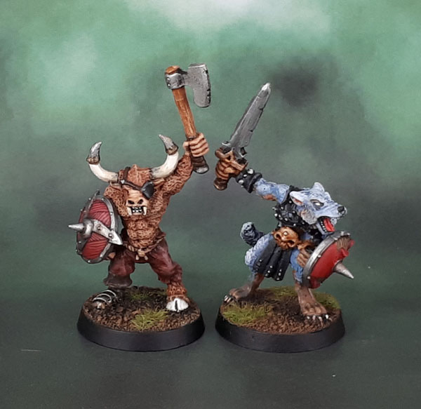 Okay, so only one of this pair is actually dog-faced, and both seem kind of generic in the sense that one of them looks very Werewolf – though human sized rather than the Ogre-sized Werewolf that seems to have taken off in the past few years of Miniature Gaming. That figure in fact is the brother figure to Wilhelm Chaney, the original 2nd Edition Bloodbowl Werewolf (bottom of the linked page). As such, the model could easily be used as a Werewolf if needed for something, albeit one armed with sword and board.