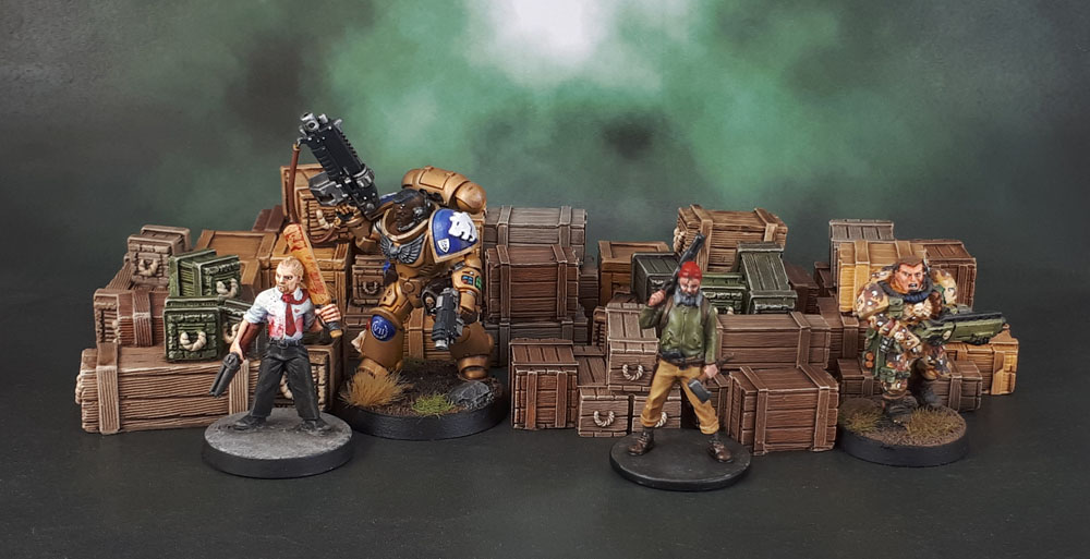 In the end, these boxes end up looking pretty good once completed. They can be used in quite a variety of games, pretty much anything from Warhammer Fantasy & Fantasy Role-Playing to the Colonial period through to 40k and Sci-Fi games. A couple of The Emperor’s finest and a pair of Zombie Hunters provide us with some scale. Probably should have had some Necromunda figures in the photos as well, come to think of it – since crates and barrels always fit into our games quite nicely. I guess the marines work for a Kill Team scale shot.