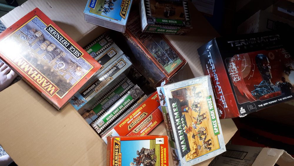 I’m cleaning up, and as it happens, I’ve got tons of old (mostly Warhammer and related) figure boxes that I’ve kept since the late 80’s, 90’s through to today. There are too many of them taking up too much space, and so one way or another – they’ve got to go! The photo above is just some of them. Sizes range from the little ones, through to the larger ones that Rhinos and stuff fit into.