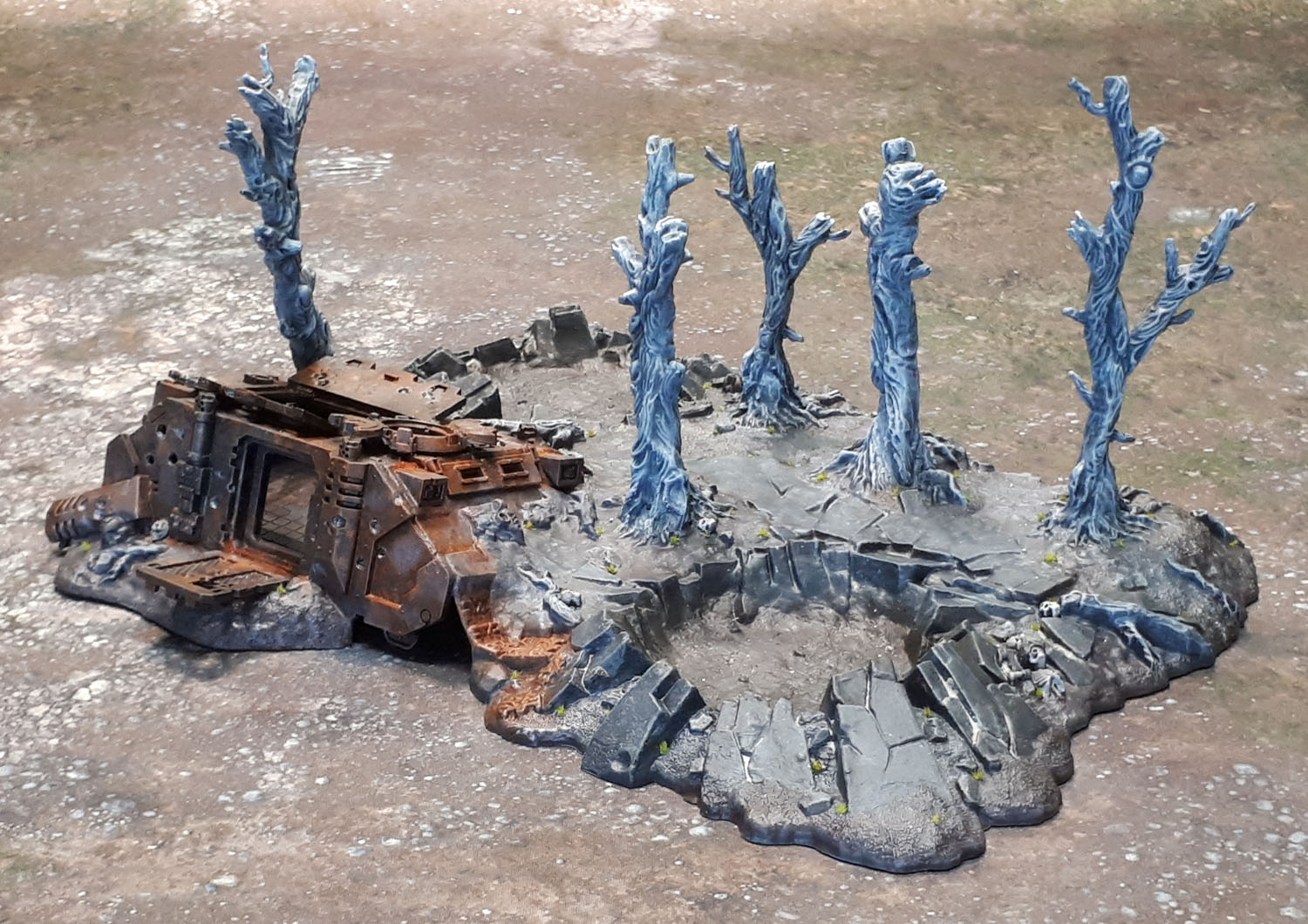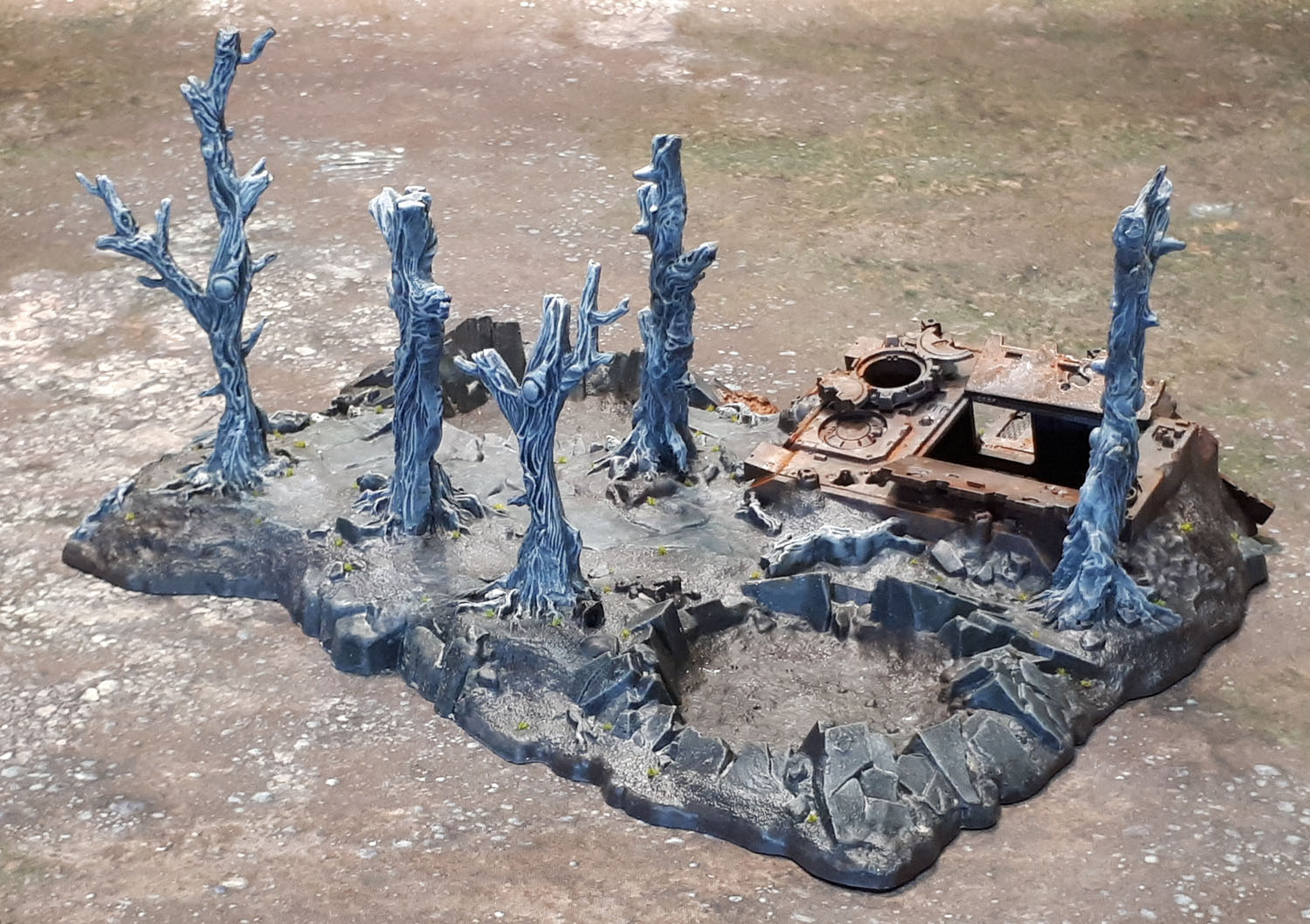 So I did what I do now – look up a ton of reference pictures. I wanted the trees to look like the husks that are left after a bushfire, so an ashy grey. That also meant that I needed to make the dirt on the ground look suitably ashen. One of my reference pictures showed an AFV that had been destroyed in Ukraine, and it was severely rusted out. I thought it looked pretty effective, so I now had a new direction for my Rhino husk. Burnt out, and then rusted over time.