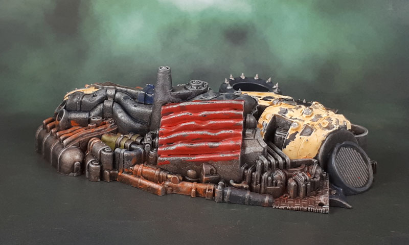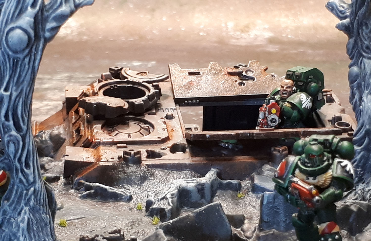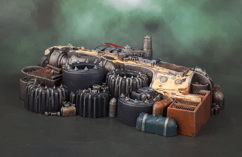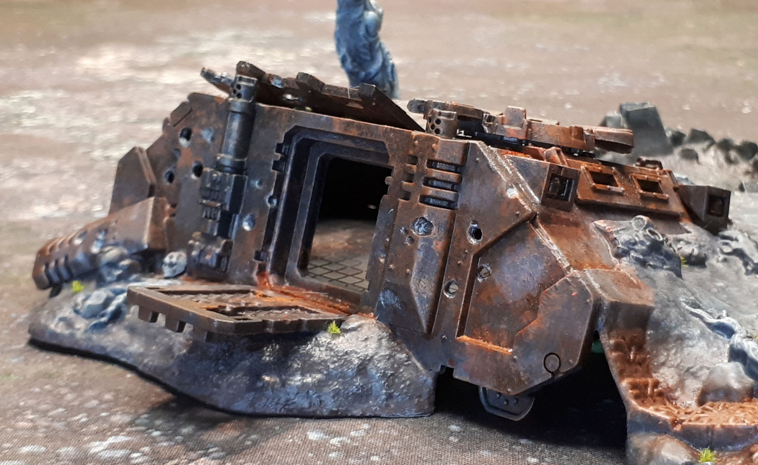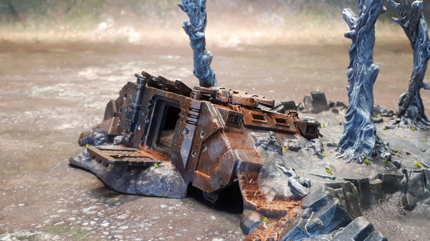 My personal brief, from way back in 2014, was to paint the kit in a generic enough way so that it could be used regardless of which forces were fighting over the tabletop. This immediately meant that the Rhino needed to be painted as a burnt-out husk, so as to avoid being in the livery of any particular force. The same applied to the bits of Space Marine scattered around the piece (a couple of helmets, a backpack, a bolter).