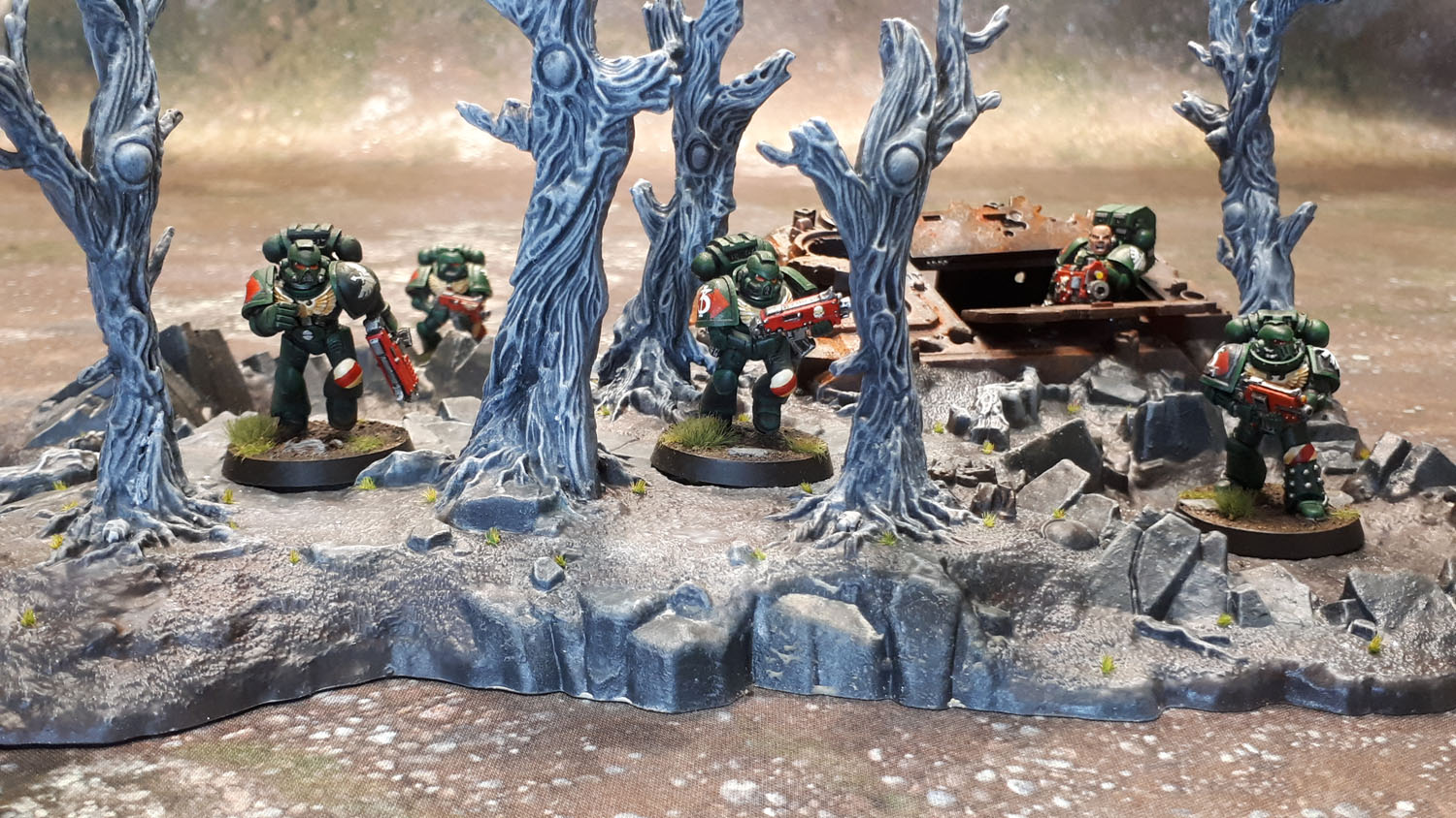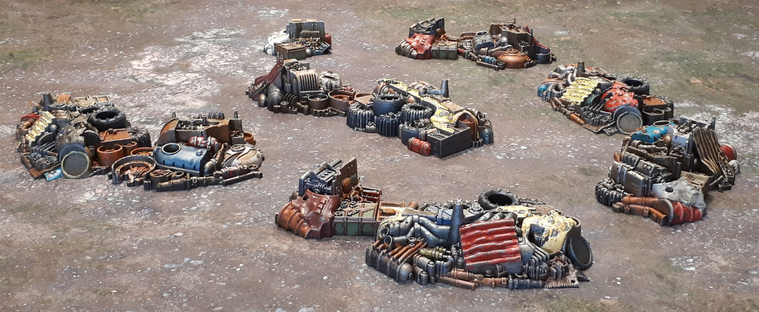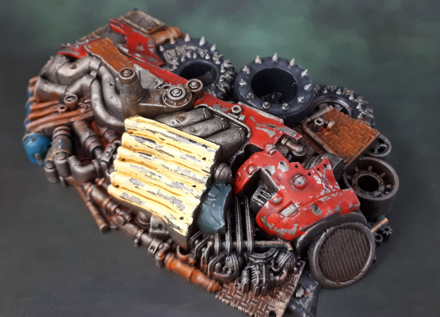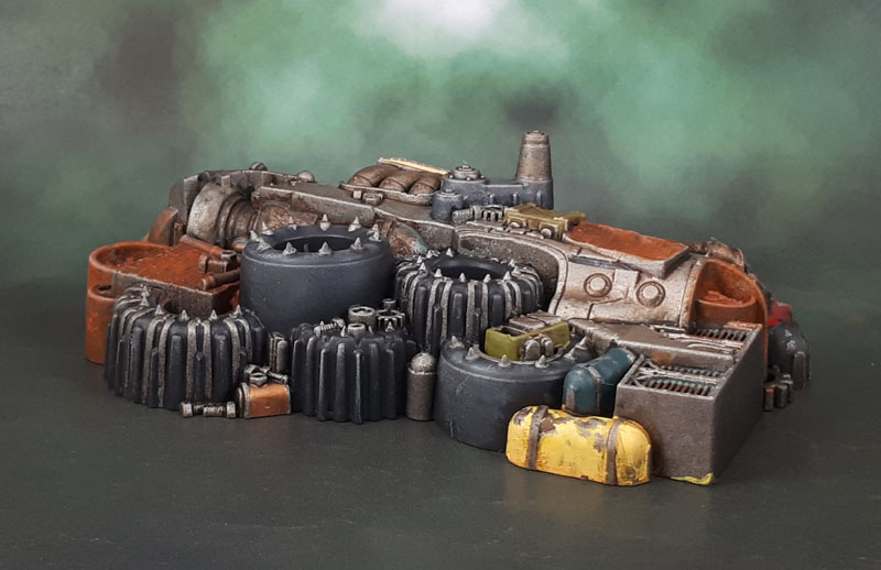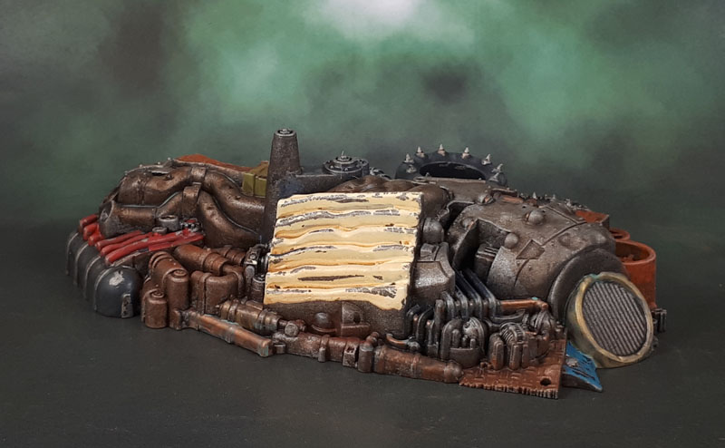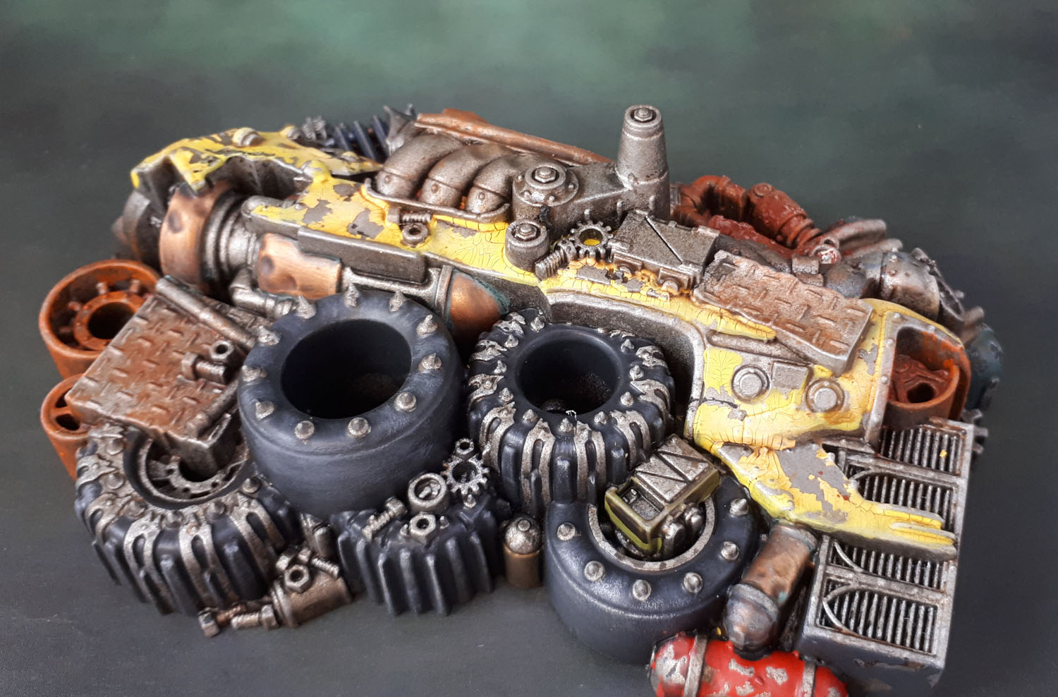 My personal brief, from way back in 2014, was to paint the kit in a generic enough way so that it could be used regardless of which forces were fighting over the tabletop. This immediately meant that the Rhino needed to be painted as a burnt-out husk, so as to avoid being in the livery of any particular force. The same applied to the bits of Space Marine scattered around the piece (a couple of helmets, a backpack, a bolter).