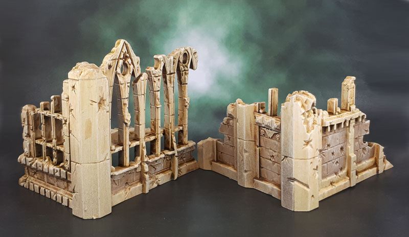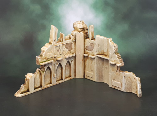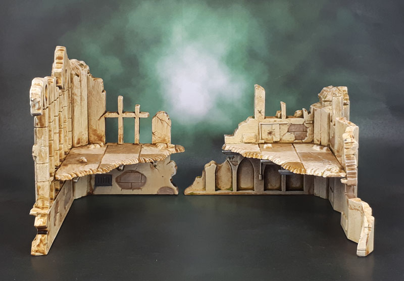 As you can see, I went with a scheme that has a little in common with what GW did with their box art, but also fits in directly with the Balewind Vortex that I painted a few weeks ago. I figure a lot of my “undead-ish” terrain will have elements in common with these. I also did some experiementing with a new metallic blue spray that I picked up recently, as well as another (failed) experiment with those Gemstone colours – just look at the rough, gloppy texture of the paint on the flat of the pyramid when the light hits it!