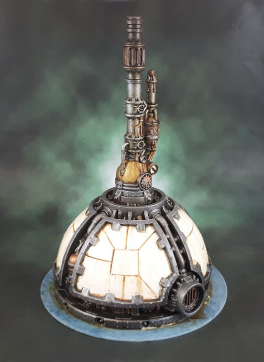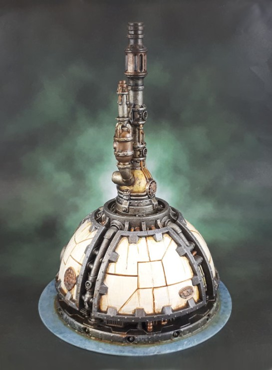 The photos are a bit higher-contrast than IRL, as the base colour of the panels is a light, cream-toned off-white. I thought it’d look good with this as a base, and then given the whole “streaky grime” treatment with that Vallejo Wash, rather than going with the chipped paint look. This kind of “painted” look to the machinery and terrain obviously takes a lot longer than going with bare or rusted metal, so I’m not entirely sure how I will proceed in future once I get past the test pieces that have been started. I do like/prefer this kind of look, but the time investment is pretty huge by comparison. I’ve got one more piece done similarly to this one, with the “cracked/chipped paint” thing from the previous one happening as well, as well as another medium and two larger pieces still in the “metal” stage before I get to assembling any more of this stuff – so I guess I don’t have to worry about deciding too quickly now…