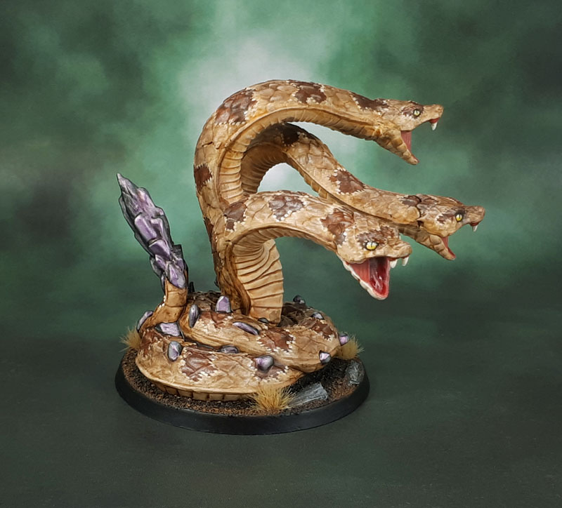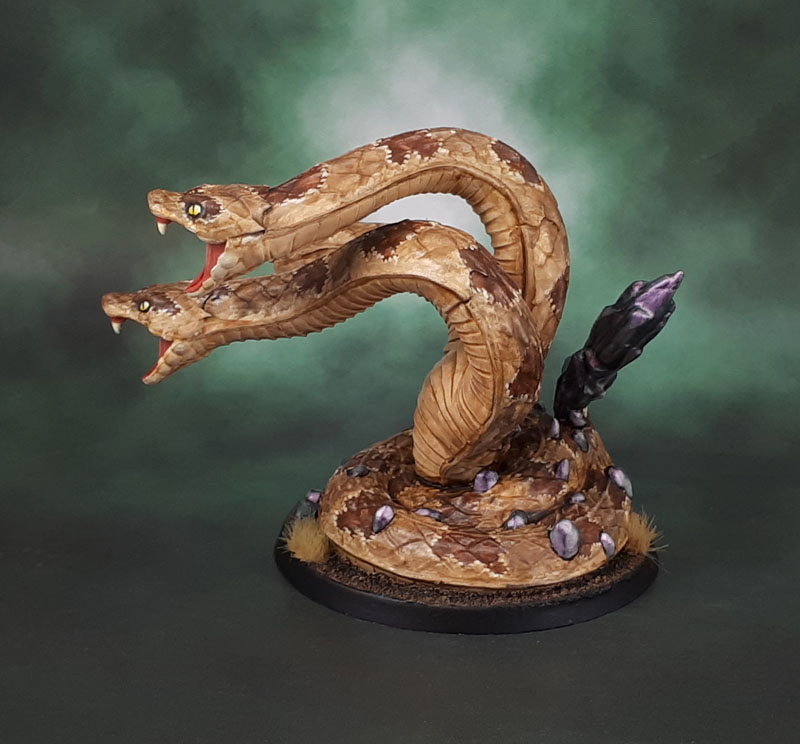 Because of the whole rattlesnake thing, I decided to paint the model in a similar manner, though having to work around the wonky sculpt added some difficulty. I mean, the easy thing would have been to go with “man paints snake green” and it would have looked fine, but I always think models that look more natural in their colouration (if not anatomy) tend to look a bit better. So I looked up some rattlesnake images on google image search and tried to make them fit the sculpt. With some difficulty because of the XXL-sized scales, initially, until later I just decided to ignore them. I didn’t even think to look up the box art (for what look like airbrushed lines on the body) until I was wondering about the crystals/stones embedded in it’s hide (and for it’s “rattle”.) Purple, huh?