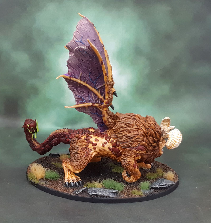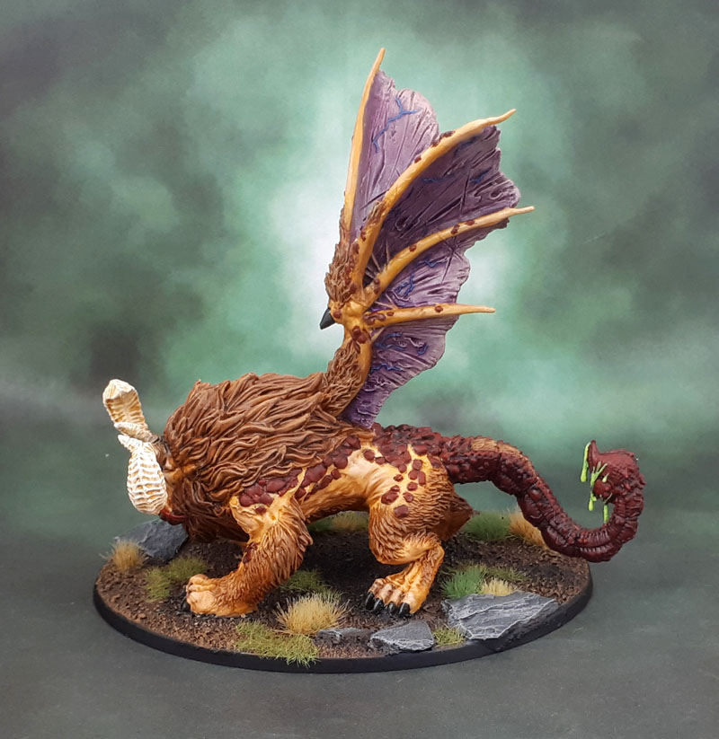 I mean, it’s no real stretch to go golden and brown with a lion’s fur and mane. The oversized, Trish Carden/Morrison-style scales (a sculpting trait which I hate, btw) across the model were done in dark red-brown to mesh with the predominant colour of the scorpion tail, which is basically a way to give more interest to something that was going to basically be… not black, but dark. Luminous green for the poison because it contrasts well with the dark red, and because green is RPG shorthand for “poison”. I went with black for the claws to match the black for the wing-talon-spikes, because I felt black would look better on the wings against the tan. I went with a purple mixed with flesh for the wing membranes so they’d stand out and look monstrous, but not quite cartoony-monstrous.