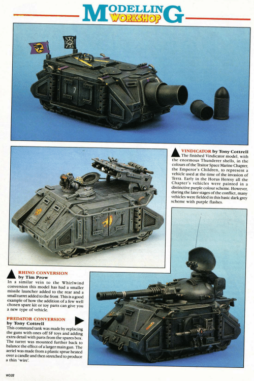 As you can see above, we’ve got the very first Vindicator and what later became the Whirlwind from an old, old White Dwarf. Some time afterwards, in 1995-ish, TimDuPertis (later Armorcast) sold a licenced conversion kit that replaced the stock front glacis plate of the Rhino with the cannon. A few years later, GW rather suddenly cancelled the licences to make 3rd party products that companied liked Armourcast and Forgeworld (yes, really) and Epicast held. They then brought many of the designs that others had been creating into their new in-house resin shop, which is the Forge World that still exists today.