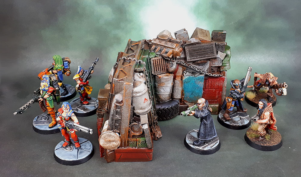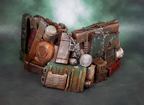 Back in December 2013 I picked up a couple of the “Bag O Crap” sets occasionally offered by Justin at Secret Weapon Miniatures. These are generally models who have failed his stringent QC process, and are sold off in these bags every so often. What you’ll get is a mystery! So I got a bunch of bases that I’ve stil not used – some with obvious bubbles and miscast issues, and others that I can see absolutely no issies with. I also got a few nicer large pieces of terrain. A destroyed tank turret, a flipped truck, a Star Wars-ish generator, and this (no link, it doesn’t appear to be listed on SWM’s site anymore!) The turret and truck are painted, the Generator is in a box somewhere. I thought I’d posted the painted turret and truck sometime, but apparently not? I’ll find them and post a pic sometime in the future.