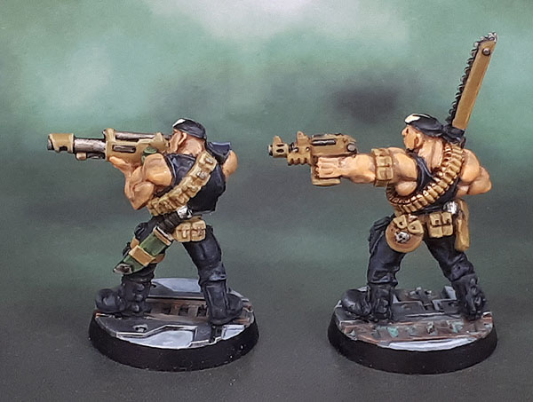 Yeah, I liked using Catachan models in my Necromunda gang. Here’s another (two) of them – in fact this was the first of the Catachans to be used as a ganger (the Blue Camo dude from last week was actually the last of them). From memory, the first of these two models was the model with the Lasgun. I think he may have picked up some close combat skills, and despite GW telling us back then that we needed to keep our models WSYWIG, there was no way I was going to chop up or otherwise fuck with my models once they were finished. I did have a suitable model to turn the guy into a Close Combat specialist, though – so I simply got a Catachan Sergeant and gave him a pistol swap. The Chainsword was probably just a regular sword. I can’t recall, but it was close enough in my estimation and nobody ever complained – so all good (remember – these were the days before a wide range of easily accessible plastics!)