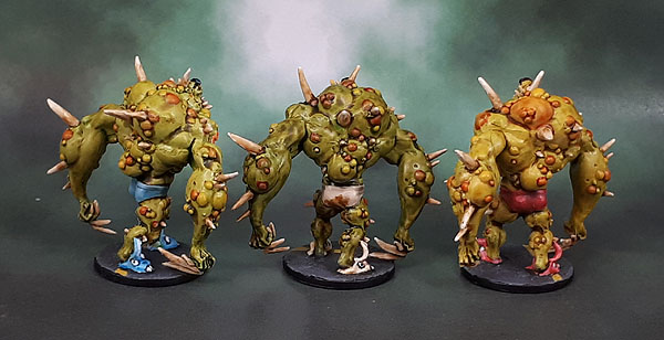 The next batch of three from my “I should paint those Zombicide Abominations” run, the Toxic Abominations from the Toxic City Mall expansion. These obviously closely follow the trio of Berserker Zombies from the other day, and were started immediately after those were completed. Like the previous batch, a lot of the work was done with Contrast paints, though I couldn’t resist combining them with “normal” painting techniques as well – which – let’s face it – is always going to give the best results. So after using different greens and combinations (because I mix my colours) from the Contrast range, these were all given a yellow glaze, and then the boils were goven some extra yellow and/or red to bring them to …the boil.