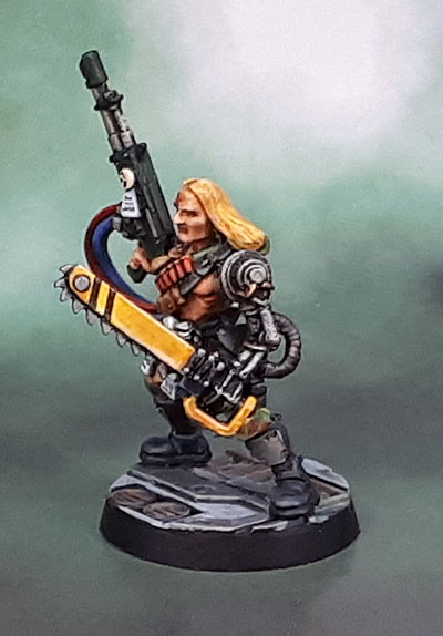 Once again, I’ve done some 2019 toning down of some of the more garish elements, and those that just didn’t look good to my modern eye. The end circle on the chainsword, along with the black and silver motor parts near the handgrip were red, the blue power cable for his (hotshot) lasgun was originally bright green, and the little parchment bounty tickets that are now white with “text” on them were previously red.
