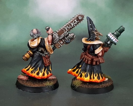 I’ve (obviously) continued with the flame motif, and the Redemptionist with Eviscerator owes a debt to mcmatilla’s Preacher with Eviscerator. After seeing his work, I knew I had to add some text to the ridiculous chainblade. May they slay the Emperor’s foes together in his glorious name! It was pretty satisfying to finish this pair after more than a decade half-painted as well, and as such I’ll throw them in for Ann’s “Paint the Crap You Already Own!” challenge as well.