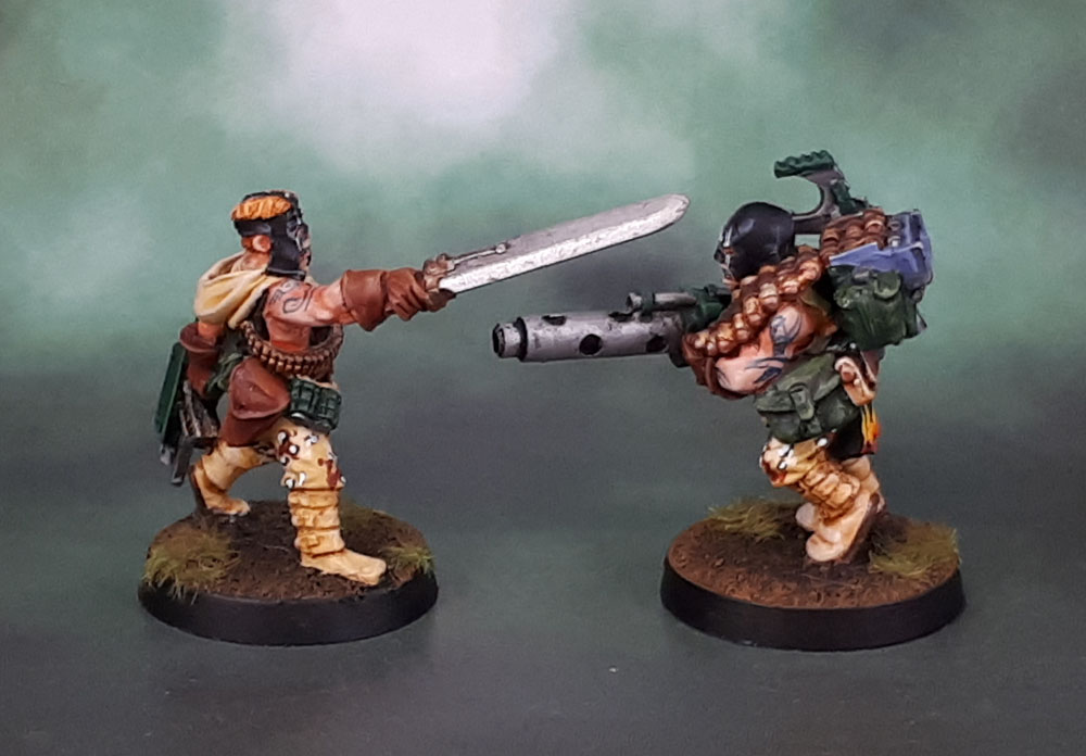 Both models have been based with “dirt” bases rather than industrial ones. This is how I based all of my original Necromunda models, and instead of rebasing these (they were part-painted for over a decade) I’ve decided to leave my Cawdor with dirt bases as it fits the updated fluff of them being one of the poorer clans, and also allows them to fit in more readily as Imperial Guard/PDF/Imperial or Chaos Cultists in games of Warhammer 40k. Hence the little touch of camo underneath their culty-flame tabards and black Grendel-hoods.