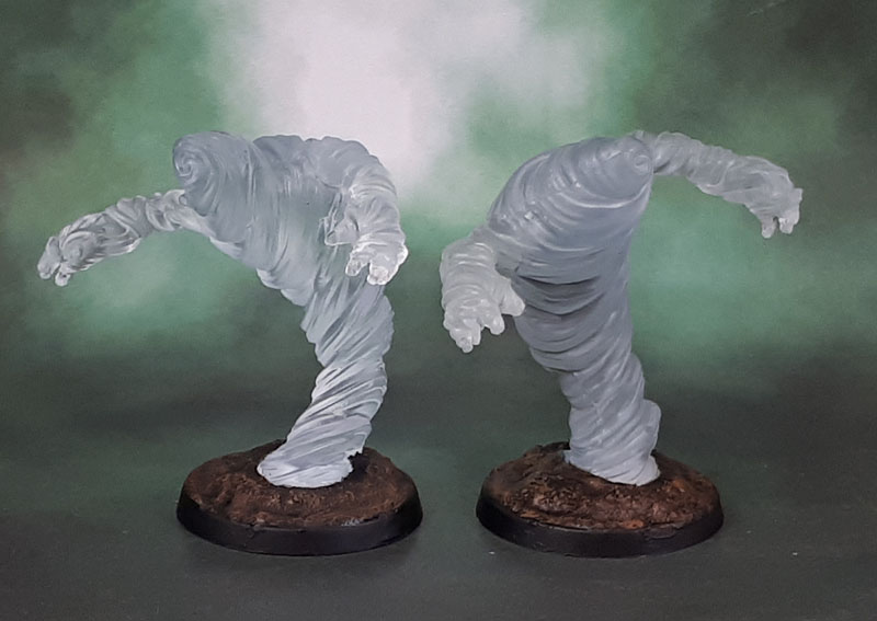 I also had this pair of Air Elementals. To be honest, these looked pretty good and fit for purpose as they were, so I decided to leave one as stock and just base it (the one on your left). For the other one, I thought a grey might look okay – not quite smoke, but not especially clean-looking air. I wondered how paint might adhere if I sprayed the figure with a clear satin coat – kind of like an invisible primer. Would it prevent the beading that occured in the Water Elementals? yes. yes it did. Though in retrospect, I should also have tried washing the oils off in a surfactant like some dishwashing liquid. Something for next time when I get some more, similar models perhaps? Anyway, this time I chose Apothecary White from the Contrast Range, which is a pale grey, meant to shade white models. The “priming” did work and worked pretty well, though the model itself is a little boring.