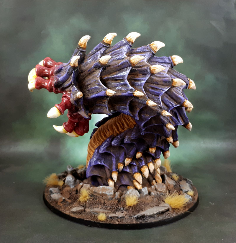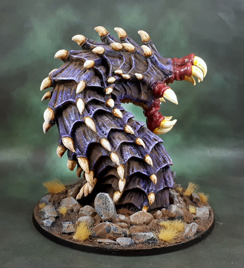 I’ve finally completed one of the larger models I’ve ever started painting – Goremaw the Devourer, aka Goremaw, Great Worm, from the third of the Reaper Bones Kickstarter campaigns. I can’t say that it was an especially fun or rewarding experience, but I am satisfied well enough with the finished product, and more satisfied simply because the product is finished. I started on my Goremaw after seeing the fantastic job that fellow blogger, Dave Kay had done on his back in December ’17–January ’18. Originally, I had been going for a black carapace to Goremaw, as I already had a pair of not-Purple Worms from Reaper that were long-finished, and seem(?) to fit the proper D&D scale (I guess, maybe?) better. However, the big, chunky detail on Goremaw’s PVC just didn’t work well with the greys I’d drybrushed on, and then Goremaw then sat around for a couple of years, neglected and shoved to the side…