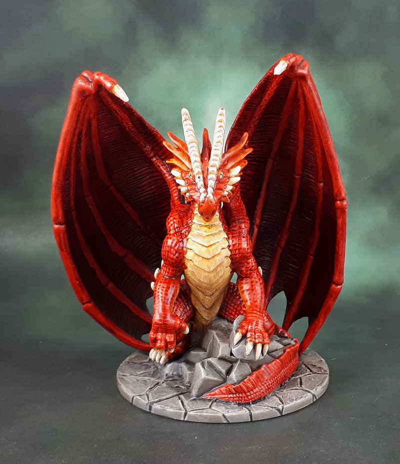 For the Ochre-Yellow underbelly I used a mix of Skeleton Bone and Nazdreg Yellow – and then went over it all to give it a chitinous appearance with streaking from several of Reaper’s “blonde” colours. Claws, teeth and talons done in the usual manner, and the inner mouth went with purple rather than red for a small bit of colour differentiation. Green eyes, the usual job on the base and rocks and done!