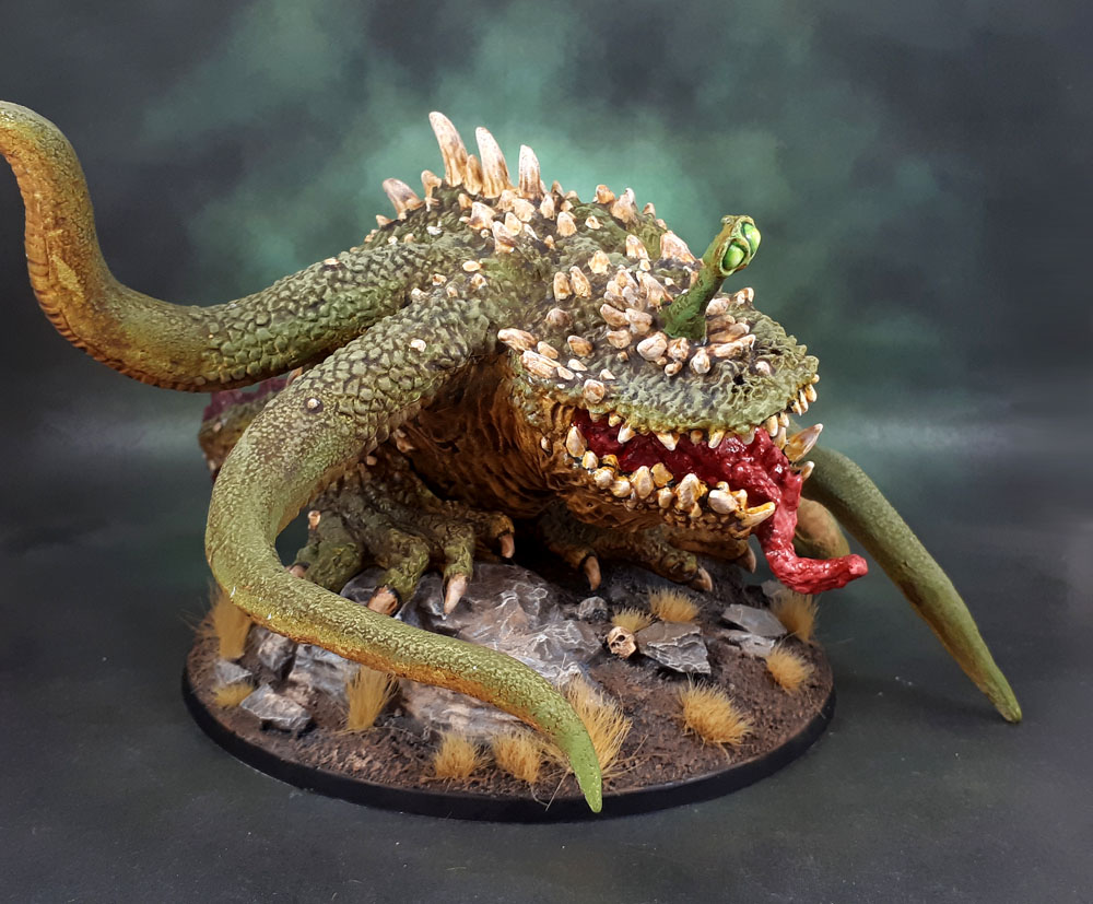 One final point on the whole Nurgle thing. Yes, I was “lazy” by just painting it green and calling it Nurgle. If you see the real plague toad models, they’re covered in pustules, torn skin, tri-marks of Nurgle and so forth. Now, if I cared more about this model, I might have attempted to go to town with greenstuff and putty. Now, I wouldn’t have been able to do nearly as much as the amazing job Pandora’s Bitz Box did there, but even so – but – this big arse chunk of heavy, cheap, underdetailed, sticky bones PVC just doesn’t warrant that kind of time investment. Even enough to add triad-pustules. Nope, I had enough trouble fighting the tackiness of this damned thing. Even with liquid greenstuff used as a primer coat and AK Interactive’s paint-on Matte varnish on top, some of it still remains tacky. Nope. Proper care and work goes to proper models. This thing is painted, and it looks decent – I call that good enough!