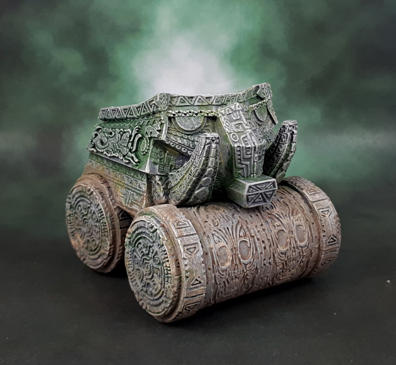 Almost every pic of these things I’ve seen online show them as being a pretty rich green. Descriptions on the other hand describe them as stone. Now, I know that greenstone (jade) is a thing, but instead I went with brownish grey stone and added some greens and ochres to repsentend mold and moss, as well as a few shades of brown on the roller wheels to represent dirt and mud (and yeah, I need to go back and add a tiny bit to the front). No green on the sections that would touch the ground though, because you know what they say about A Rolling Stone…