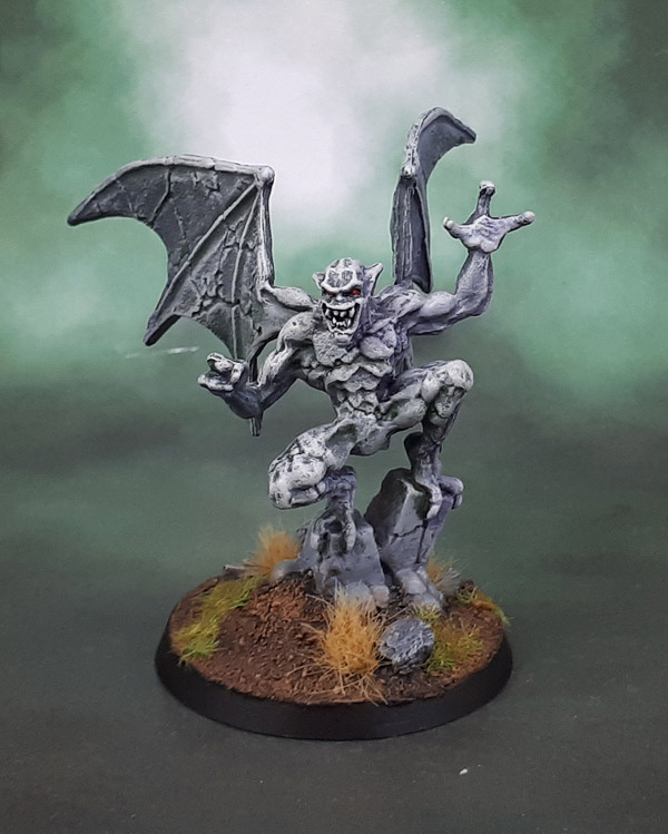This particular gargamel model is even more of a quandry – this particular Bob Ridolfi sculpt is these days available in Bones plastic as 77028: Mortar, Gargoyle or (totally) Metal as, erm. “03223: Gargoyle“. The model we have here, though was actually one from Reaper’s (apparently discontinued) Legendary Encounter series of prepainted Bones models.