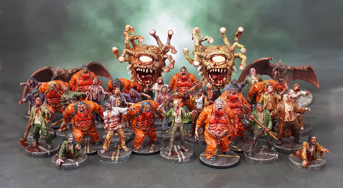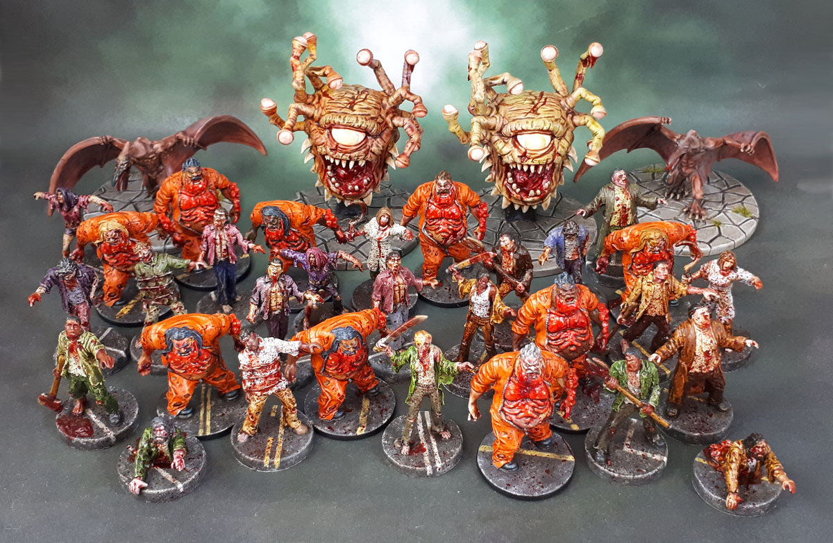 Well, that was November’s painting posted up quickly. 34 Boardgame models. 21 Zombies, 9 Mutant Zombies, 2 Beholder Zombies and 2 board game pterodactyl people. I think it’s explained pretty easily in that when you’re having a rough time and maybe can’t concentrate well enough for those fine details that you enjoy – but still want to paint, some of the best stuff you can work on are terrain, zombies and board game models. Board game models for the reason that (excepting ones from GW and the like) they tend to be a bit less detailed and so a bit more forgiving. After a good solid run of several months dominated by scenery, November was the third month when my model output was dominated by board game models. And let’s face it – zombies are some of the most forgiving models you can choose to paint!