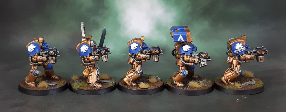 These models are all “rescue marines”, in that they were aquired secondhand and then repainted (and to some extent, reassembled). The most significant of those being the addition of a Grey Knight’s unhelmeted head, arm and weapon (as well as the Aquila standard) to designate the Sergeant – as well as a Deathwatch shoulder pad.