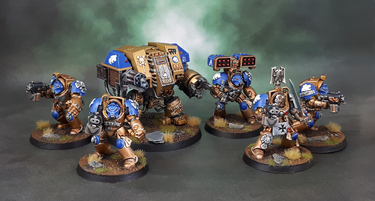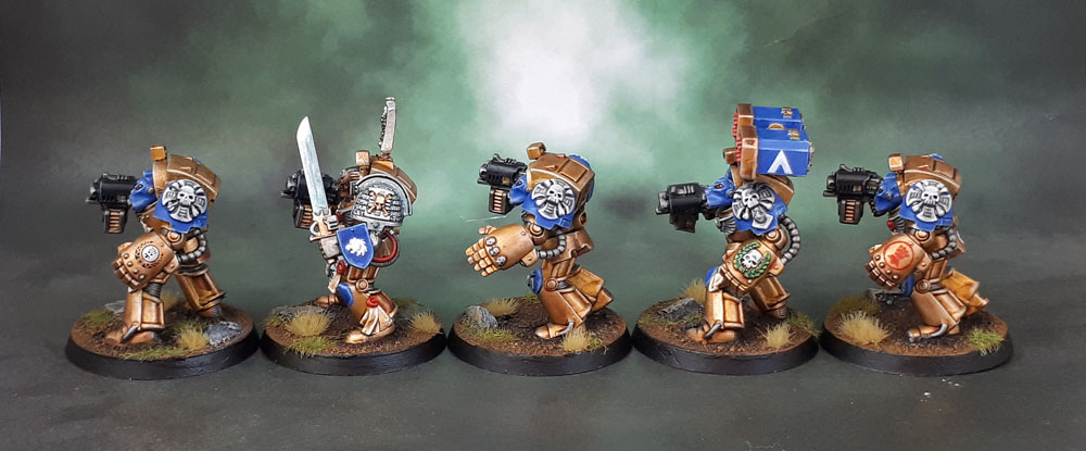 I didn’t do a lot of painting in December, but I did pick away at this squad of Celestial Lion Terminators that I managed to finish off on Boxing Day. Well, I say “finish”, but I’m waiting on some decals that I still need to add to those blue kneepads.