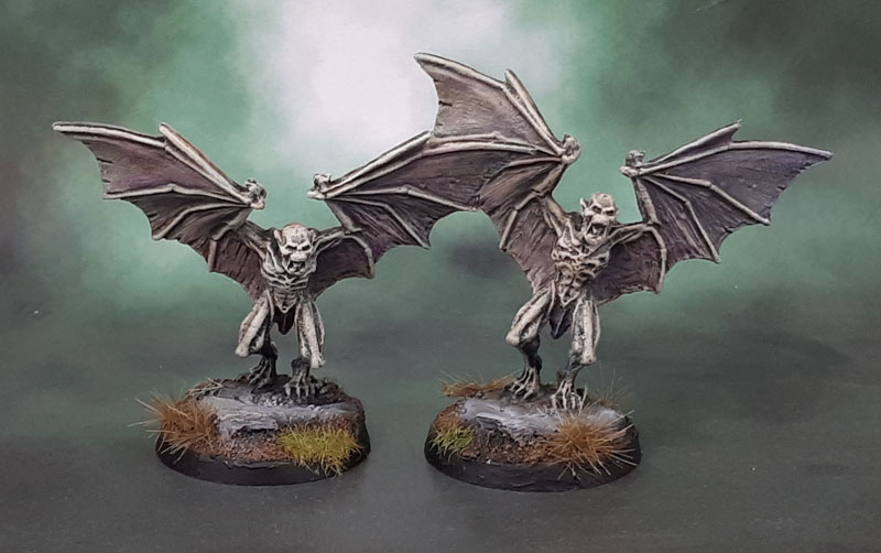 The other pair of Bones models that I painted alongside the two Death Shrouds from yesterday were this pair of gargoyles. Well, I thought they were Gargoyles, anyway until writing the text for this post! Turns out, this model is something called Vorvorlaka, and is, in fact, a Vampire. I guess I can see that, in that mostrous and bestial form of vampire we sometimes see. Still, these models hardly scream “hero”-type model to me, so they’ll just be used as a pair of gargoyles in whatever RPG or boardgame or minatures game that calls for a couple of them. I also achieved the slight variation in pose by… I didn’t do anything – they’re bendy PVC models!
