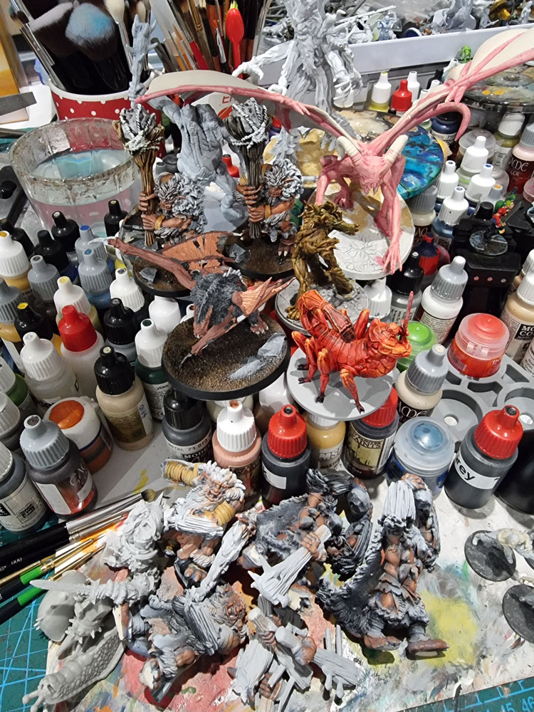 It’s far from a nice WIP shot, and probably resembles something more akin to abstract expressionism, or alternately, your local dump, but it does show the Yetis I decided to work on, the bat-vampire-demon that distracted me from the yetis, the scorpion-guy that distracted me from the bat-vampire-demon, and also a winged demon-monster from Shadows of Brimstone, a very specific treeman, and a non-specific treeman who have all been sitting, part-done in or out of the tray for quite some time now.
