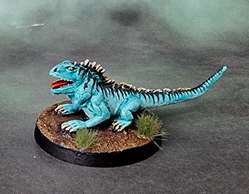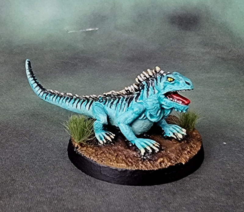 As I have been working on 3 models at the same time I found that the larger models I have been painting were a lot more fun to paint. I enjoyed painting the body of the iguana, it was fairly simple scheme using P3 Arcane Blue and thinned Aethermatic Blue contrast paint. Azazel painted the eyes and teeth on it because I could see myself messing this up big time with too much paint and a shaky hand.