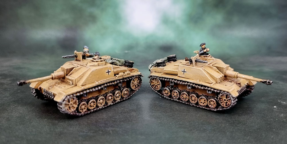 As I noted in the DAK army post, I did a bunch of work on my never-fully-completed old-school Tiger I to make it fit in with the colour scheme used by the other armoured vehicles I was finishing at the time. When it came time to take those photos, I found that my pair of Stug IIIGs annoyed me in how they stood out with a different, much paler finish – so I created some paint filters and went back over them with those (as well as washes) to get them to a better place.